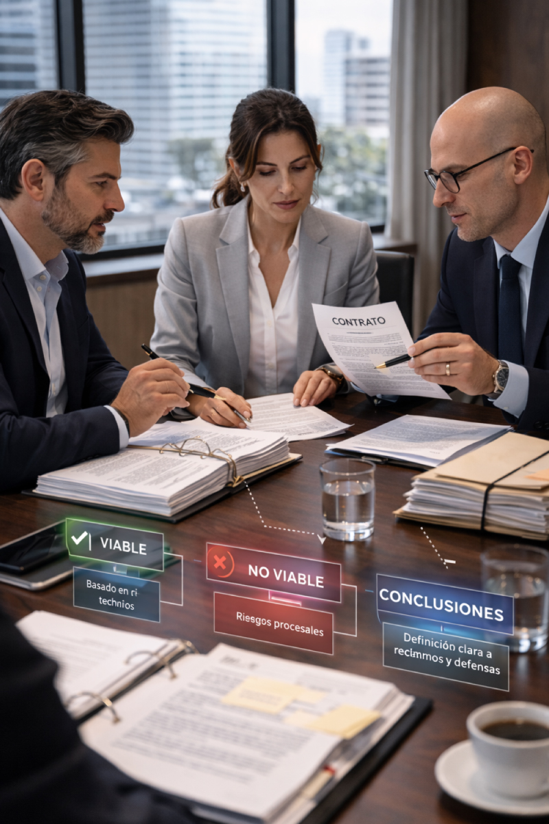 Es un diagnóstico técnico–legal que permite entender con claridad tu posición contractual antes de iniciar o enfrentar una disputa. Ordena el caso, identifica riesgos reales y presenta escenarios estratégicos viables para decidir con información sólida si conviene negociar, activar mecanismos contractuales o preparar un arbitraje.