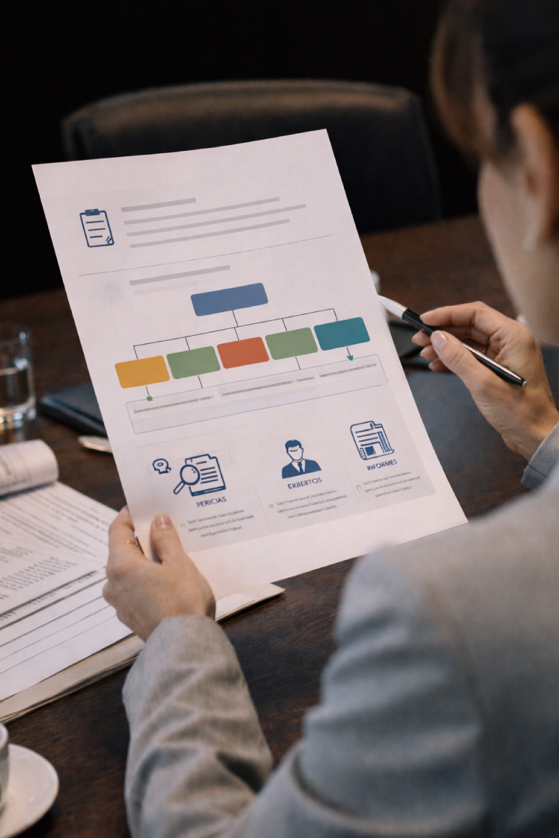 • Recomendación de pruebas técnicas esenciales o adicionales (pericias, expertos, informes).